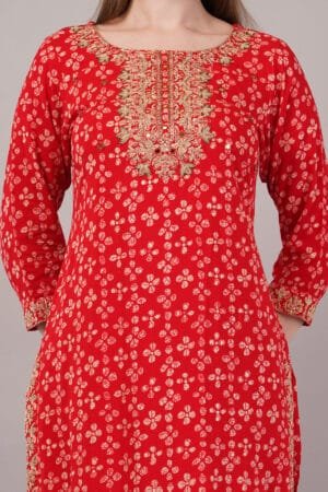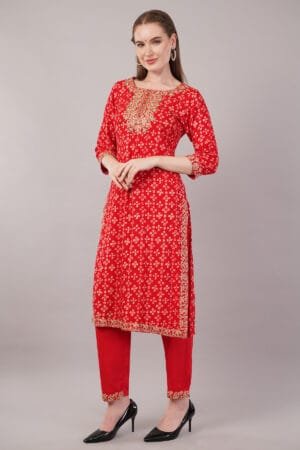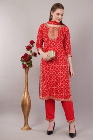 Elevate your ethnic wardrobe with this exquisite Salwar Suit Set featuring stunning embroidery and intricate Tilla work. The ensemble includes a beautifully embroidered suit paired with a flowing shiffon dupatta that adds grace to your movement. The detailed craftsmanship and traditional needlework showcase the rich heritage of Indian artistry. Perfect for special occasions, festivals, or formal gatherings, this suit set combines classic design with contemporary elegance. The shiffon dupatta drapes beautifully, complementing the embroidered suit with its ethereal charm. The set offers a perfect blend of comfort and style, making it suitable for both daytime events and evening functions. The versatile colour palette ensures you can accessorise it with various jewellery pieces to create different looks. Please refer to the size chart to select your perfect fit. Gentle hand wash recommended to maintain the suit’s pristine condition and preserve its intricate detailing.