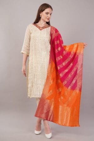 Elevate your ethnic wardrobe with this stunning Shimmer Suit Set, featuring an exquisite Banarsi dupatta that adds a touch of traditional elegance. The ensemble comprises a beautifully crafted suit with shimmering details that catch the light perfectly, making it ideal for festive occasions and special celebrations. The Banarsi dupatta, known for its rich heritage and intricate patterns, perfectly complements the suit’s contemporary design. This versatile set combines comfort with style, making it suitable for both formal gatherings and cultural events. The salwar provides excellent mobility while maintaining a graceful silhouette. The fabric selection ensures comfort throughout wear, while the overall design speaks volumes about traditional Indian craftsmanship. Perfect for wedding functions, festivals, or any special occasion where you want to make a lasting impression. To maintain its beauty, dry clean is recommended. Please refer to size chart before placing your order.
